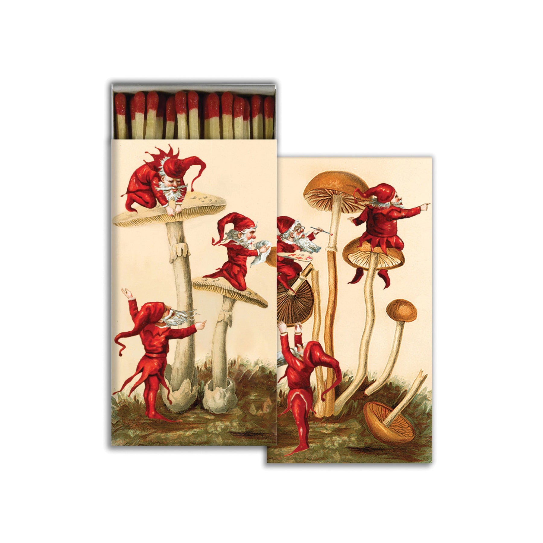 Step into a whimsical forest with this delightful matchbox, adorned with gnomes playing on mushrooms. Each strike of the vibrant red-tipped matches becomes a mini journey into a magical world of fantasy and fun. Perfect for lighting candles or fireplaces, or simply displayed as a charming accent, this matchbox blends practical use with playful design. Includes 50 matches.
