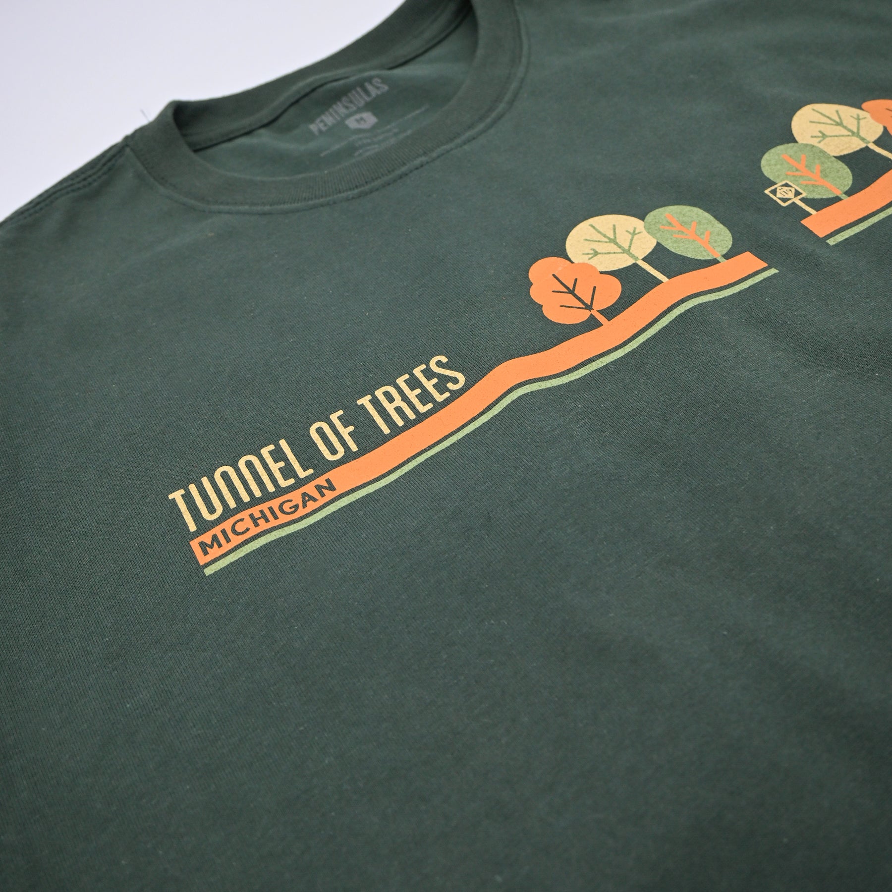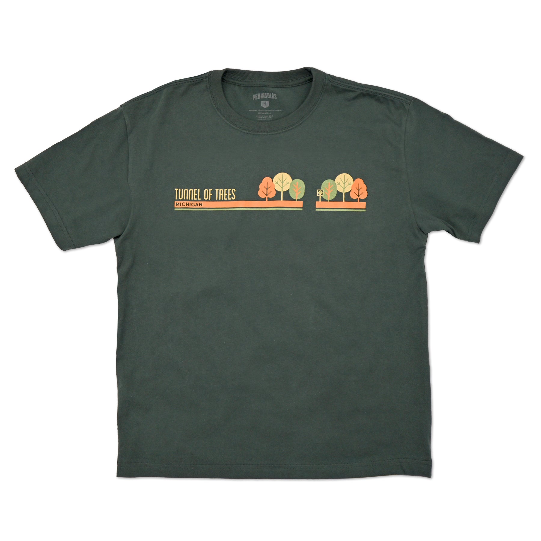 Vintage souvenir tees had a certain magic—bold, blocky graphics, rich colors, and that “brought it back from vacation” bragging right. This design channels that era with a nod to one of Michigan’s most scenic drives: M-119, the Tunnel of Trees. From the sunlit curves along Lake Michigan to the quiet stretches shaded by hardwood canopy, it’s a route that’s as nostalgic as it is beautiful.