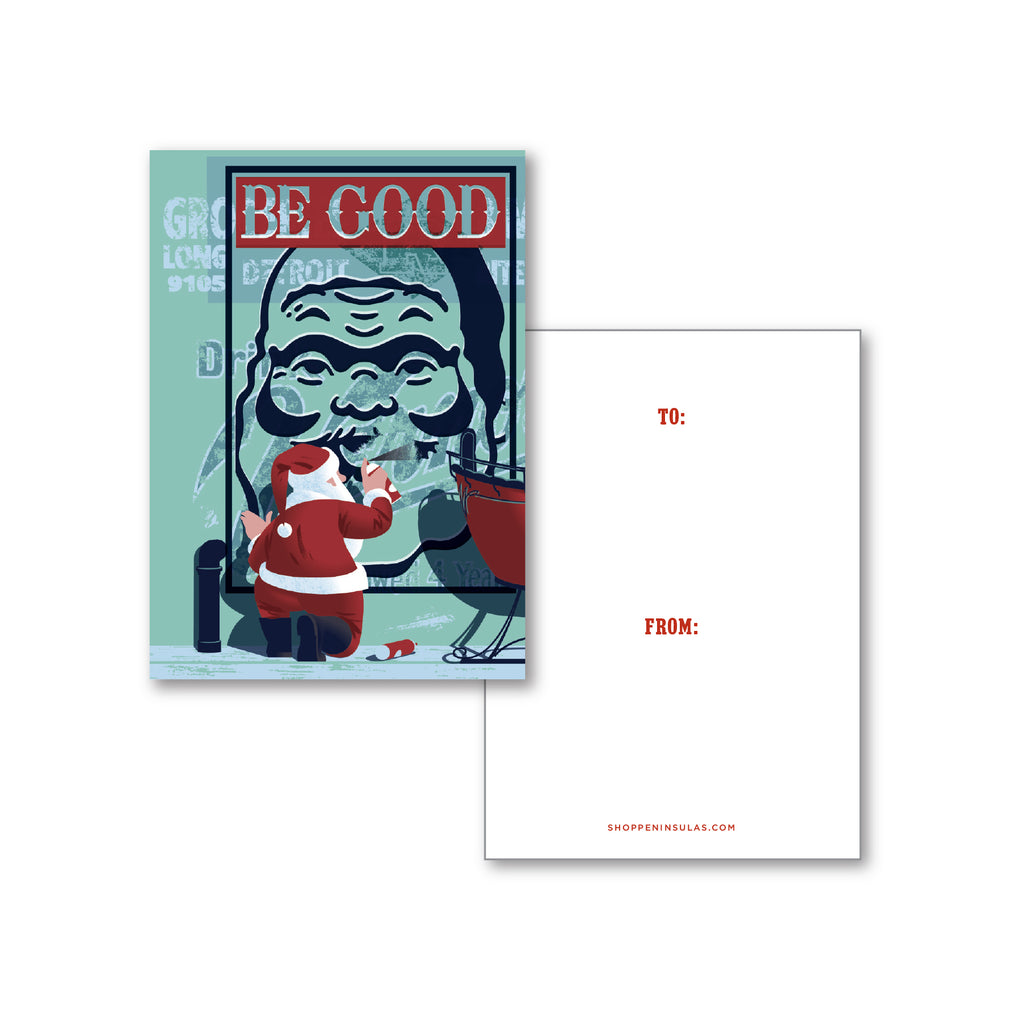 Add a Motor City edge to your holiday greetings with this Detroit-themed gift enclosure card. Featuring a playful Santa spray-painting a “Be Good” message, this card captures the city’s vibrant street art culture and festive spirit.
