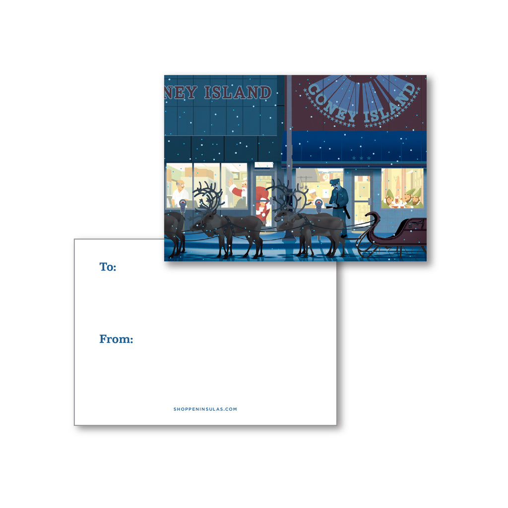 Celebrate the season—Detroit style. This festive gift enclosure card gives a holiday wink to the city’s legendary Coney Island tradition, with Santa himself grabbing a pair of chili dogs with everything. A fun, flavorful nod to local pride, this design brings humor and heart to any gift.