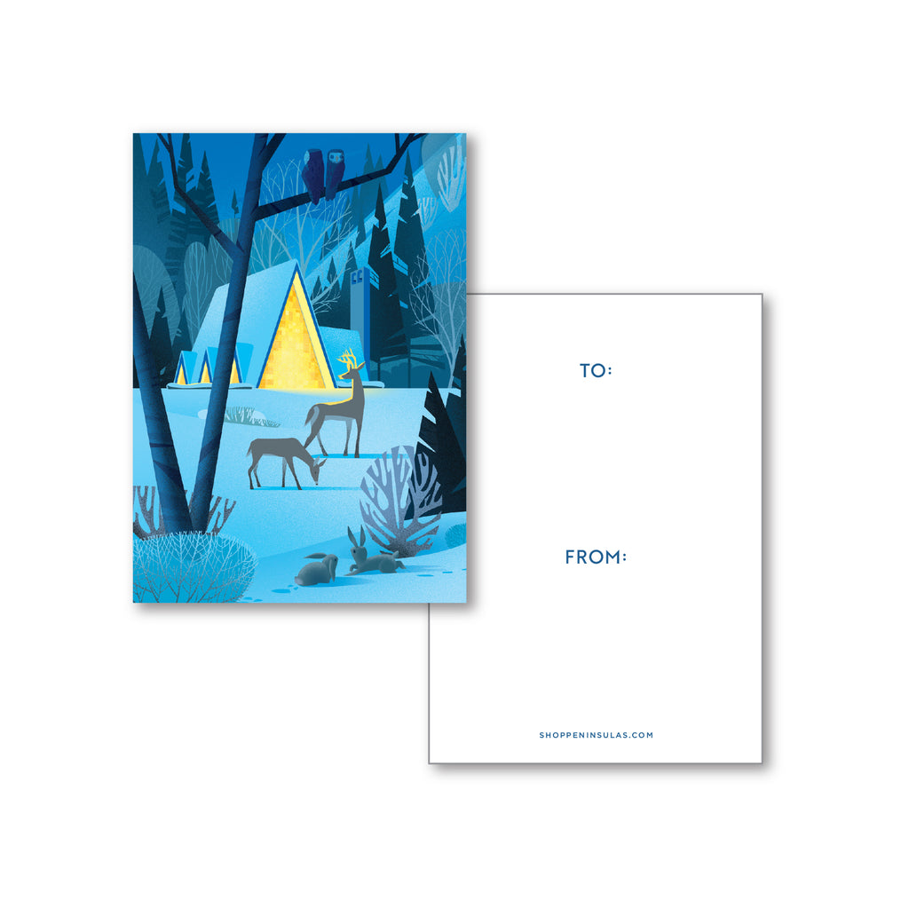 Capture the serene beauty of winter with this Mid-century modern-inspired gift enclosure card. “Winter Sanctuary” depicts a snowy evening where deer watch quietly through the woods, while warm light spills from the windows of a cozy A-frame cabin.