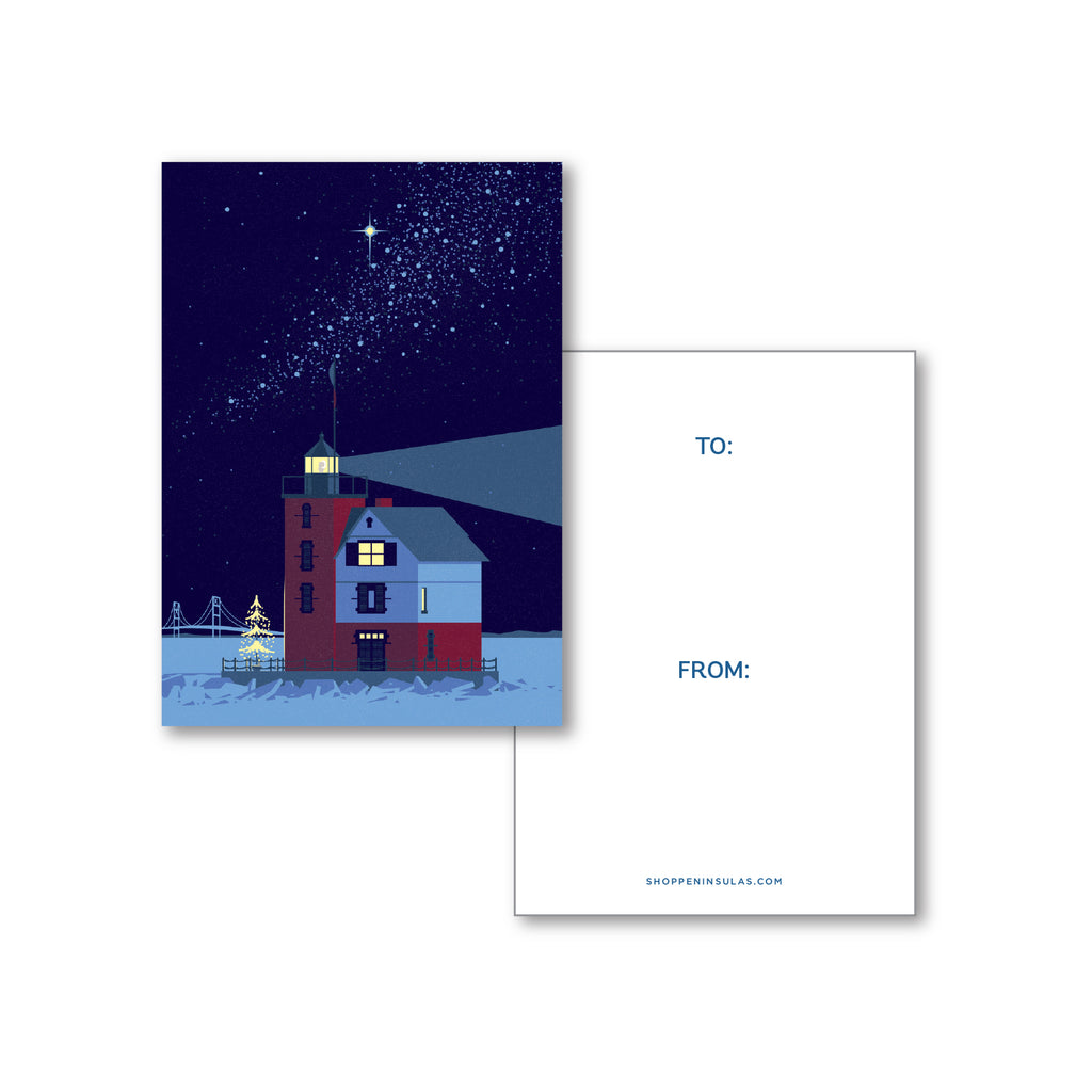 Whether you’re sending holiday cheer across the country or slipping it into a local gift, this design is perfect for lighthouse lovers, Great Lakes fans, and anyone who keeps the magic of Michigan close to heart.
