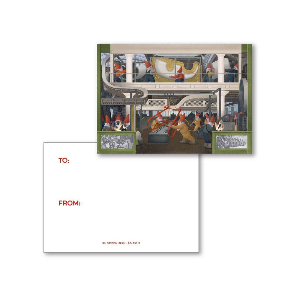 A holiday homage to Diego Rivera’s Detroit Industry fresco at the Detroit Institute of Arts, this playful gift enclosure card is inspired by the South Wall panel where assembly line workers put the finishing touches on the North Pole’s preferred mode of transportation.
