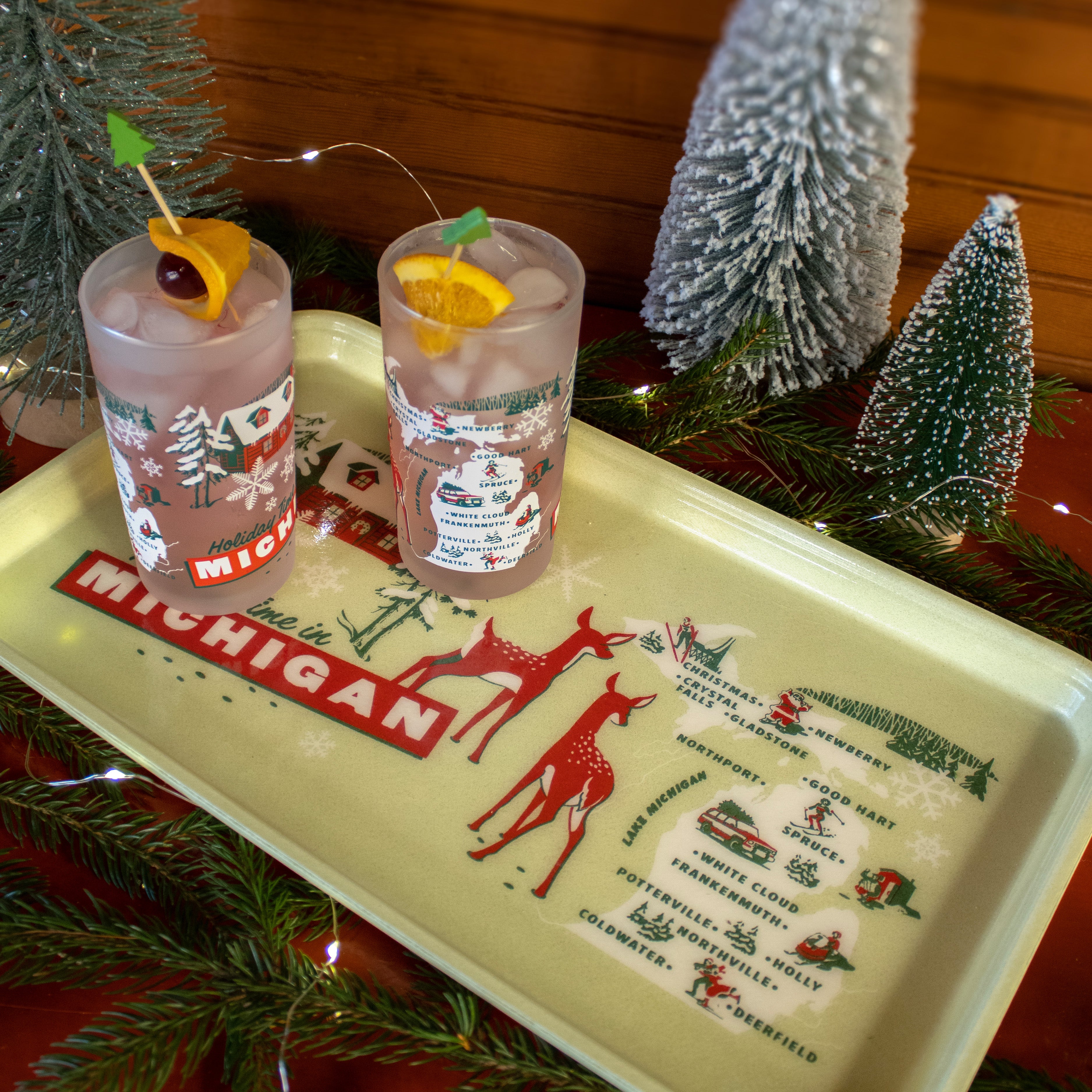 Celebrate the season Michigan-style with this festive serving tray featuring a vintage-inspired map that highlights seasonally named towns like Christmas, Holly, Good Hart, Northville, Newberry, Crystal Falls, and Potterville—a cheerful nod to Michigan’s holiday spirit.
