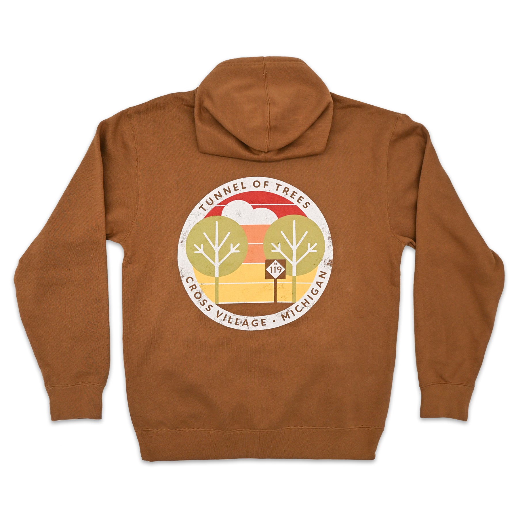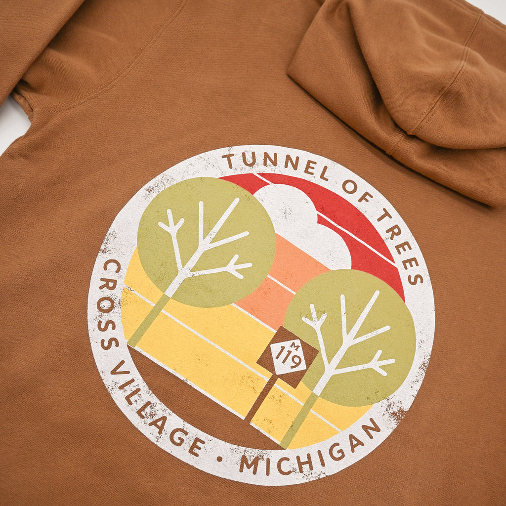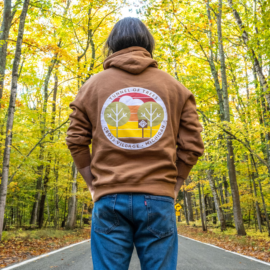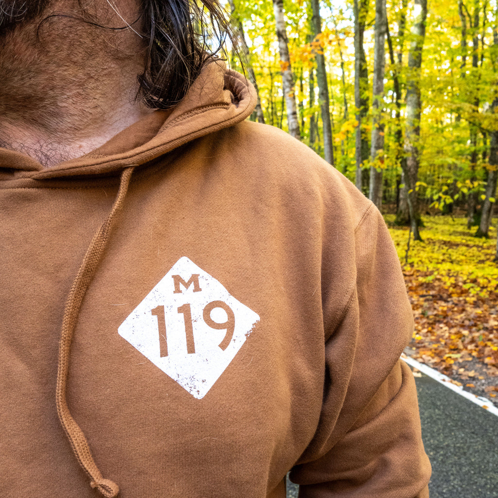 Some drives become part of you. The Tunnel of Trees—M-119—is one of those rare roads, where every bend reveals a postcard-worthy view and every mile feels like a memory in the making. This retro-inspired hoodie captures that spirit in a bold circular M-119 graphic with a distressed finish, intentionally designed to look faded and worn—just like the souvenir sweatshirts you’ve been reaching for since your first Up North adventure.