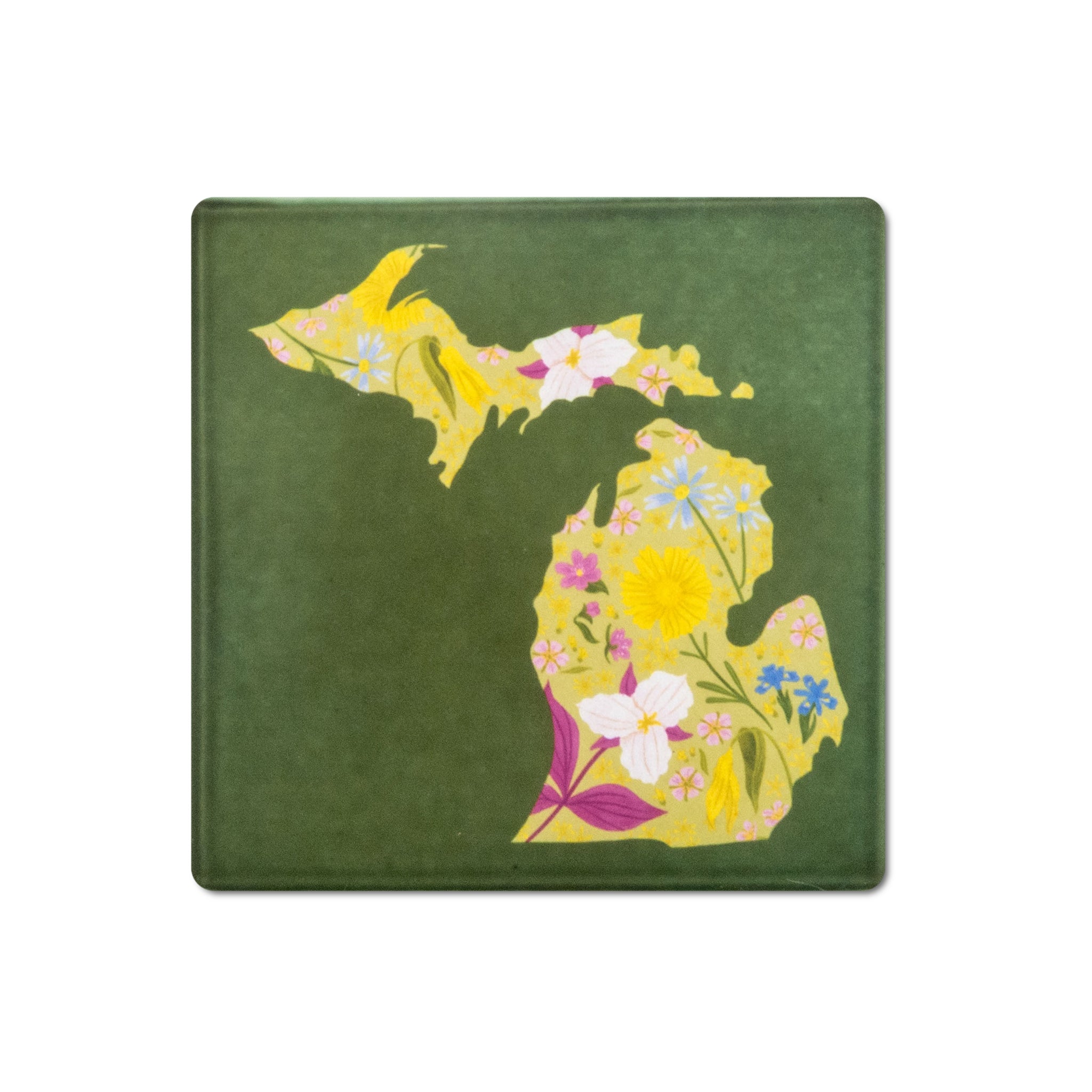 This design brings together eight native Michigan wildflowers—Bellwort, Common Trillium, Dwarf Lake Iris, Houghton’s Goldenrod, Large-Leaved Aster, Large-Flowered Coreopsis, Round-Lobed Hepatica, and Wild Strawberry—each one a reminder to slow down and notice what’s underfoot. Familiar to those who wander woods, trails, and shorelines, these flowers speak to the subtle beauty that returns year after year across the Great Lakes State.