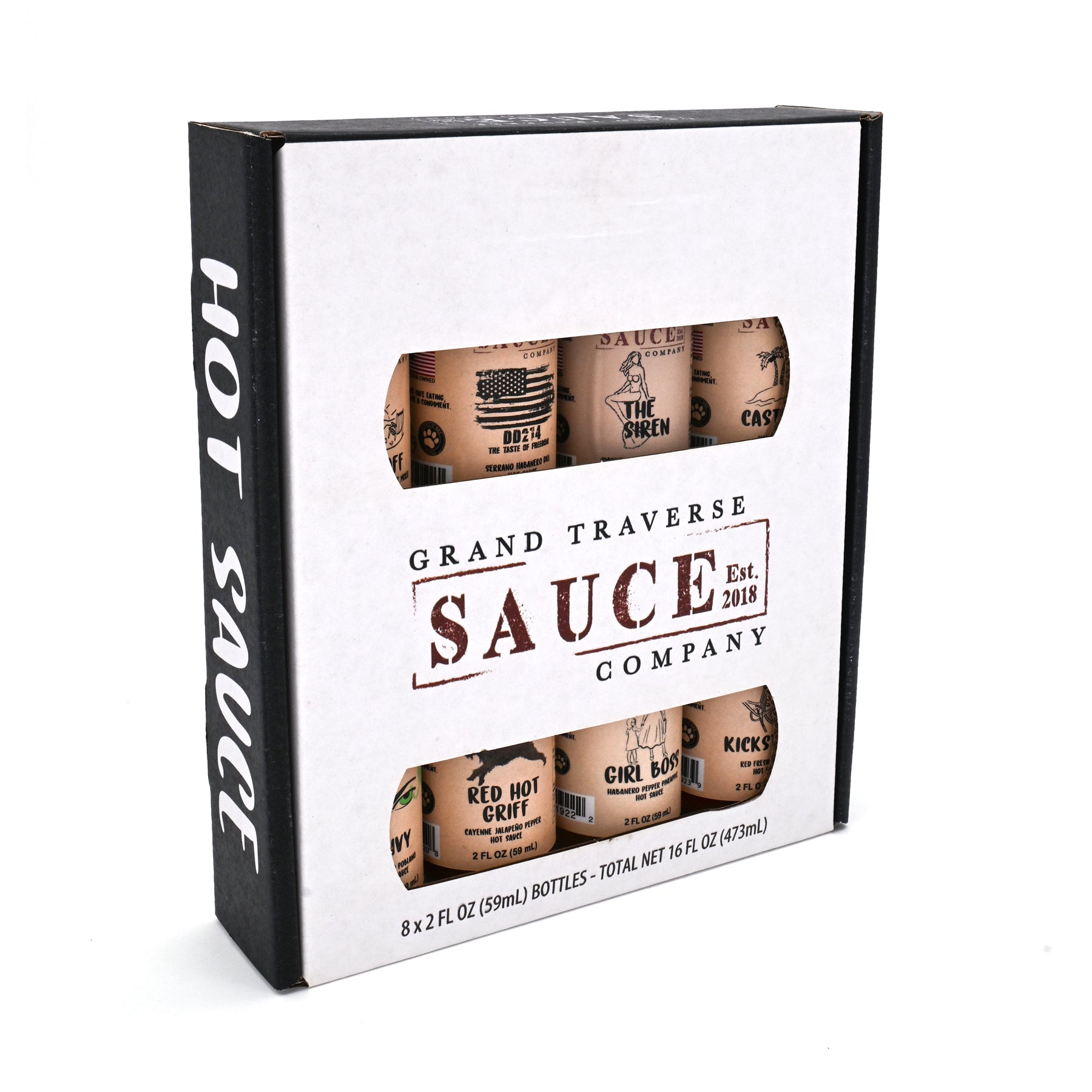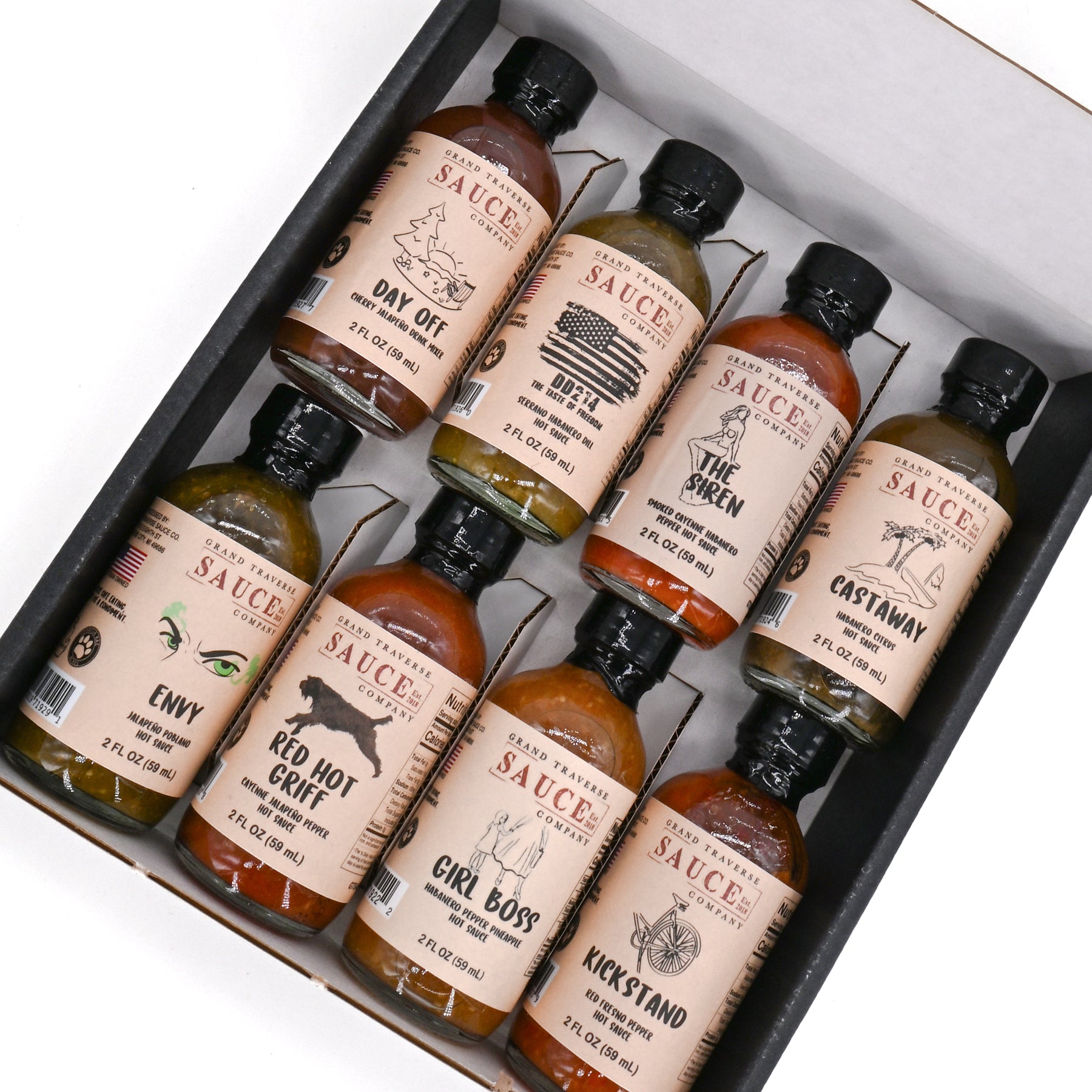 This boxed set contains eight 2-ounce bottles of their most popular hot sauces and drink mixes: