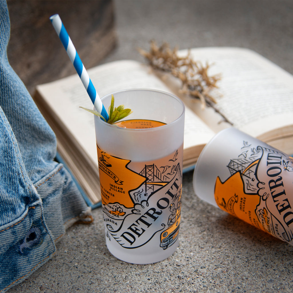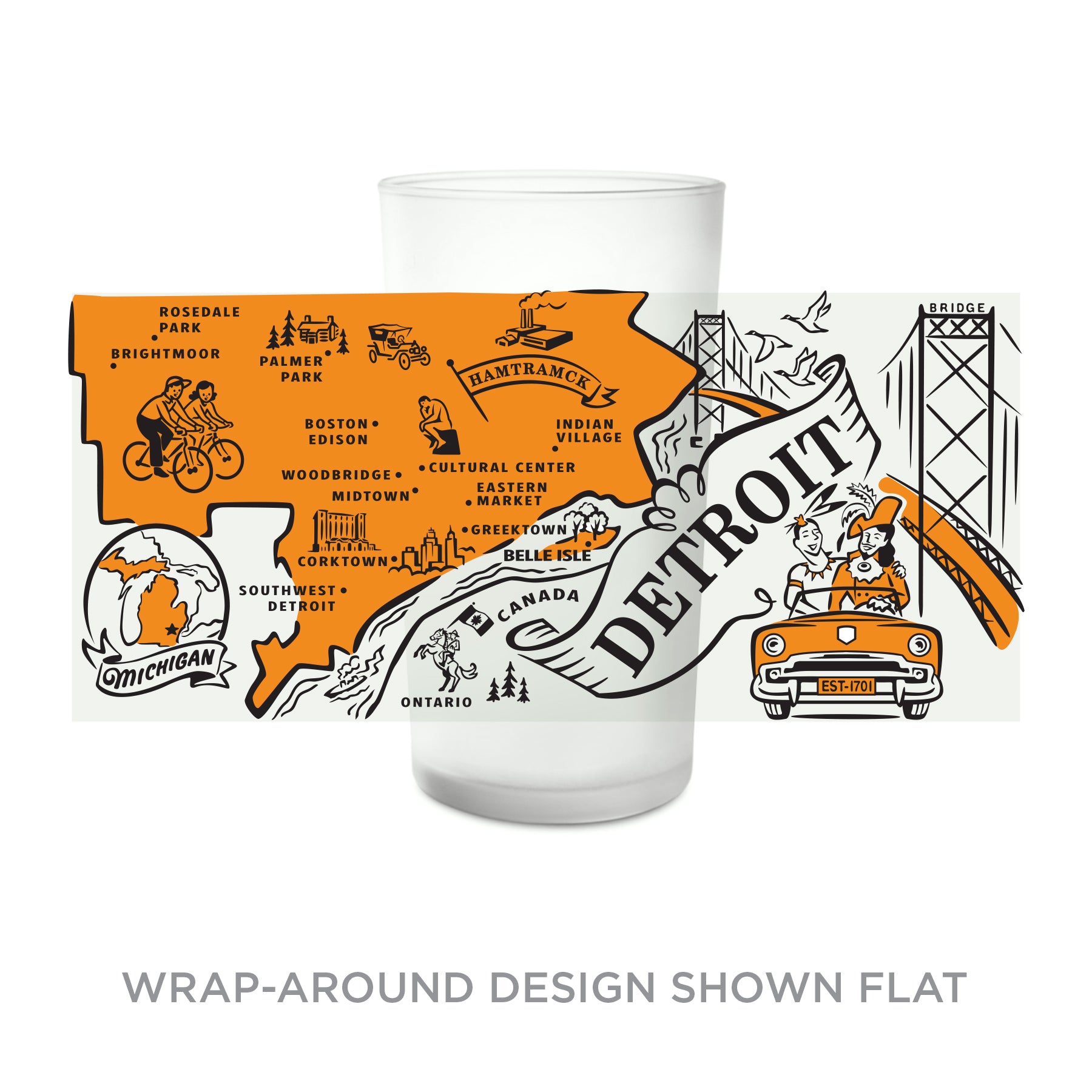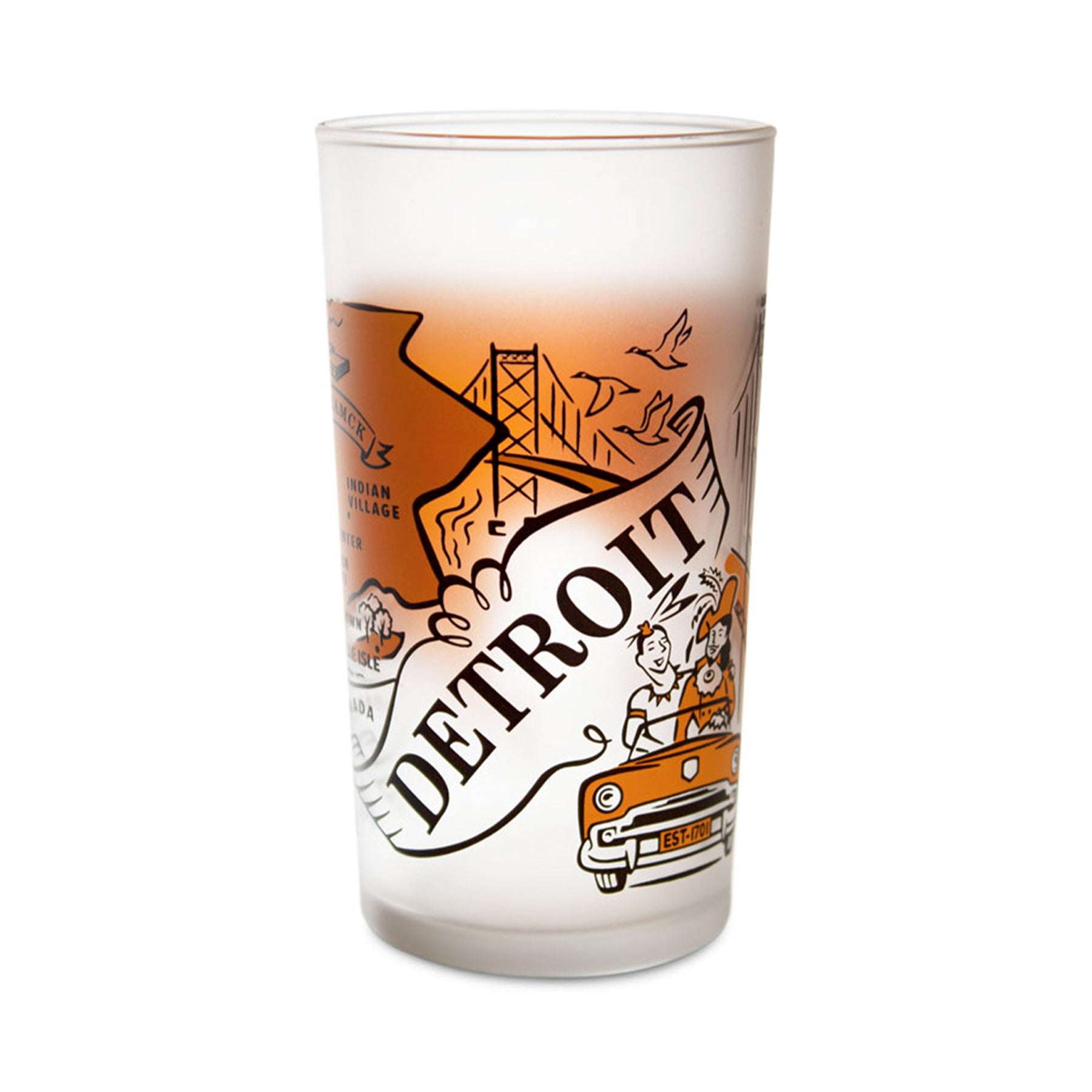Designed in-house, this retro-inspired City of Detroit souvenir glass is modeled on collectible state glasses of the mid-1950s once sold in tourist shops. A keepsake then and now, it’s perfect as a collectible, a gift, or for enjoying your favorite beverage while celebrating Detroit pride.