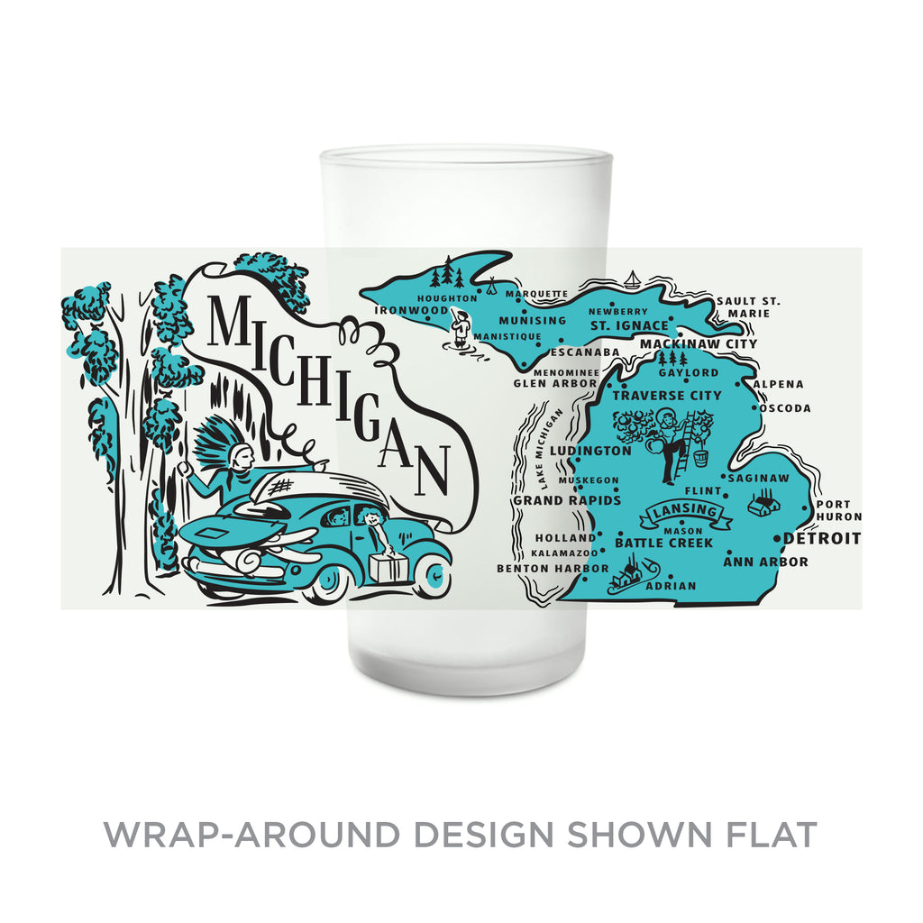 Designed in-house, this retro-inspired frosted Michigan glass is modeled on collectible souvenir glasses of the mid-1950s once sold in tourist shops. A keepsake then and now, it’s perfect for morning juice, an evening cocktail, or just showing off your Michigan pride.