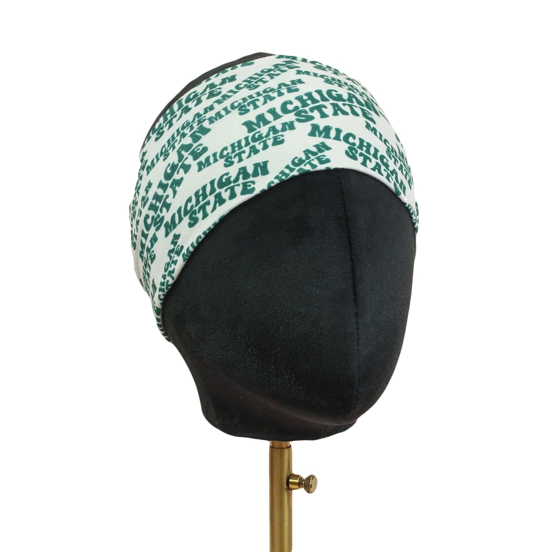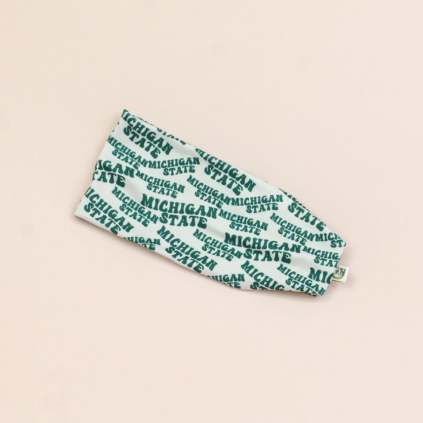 This headband showcases a playful "Michigan State" text pattern in green on a crisp white background—perfect for Spartans fans who want to show their school spirit in style.