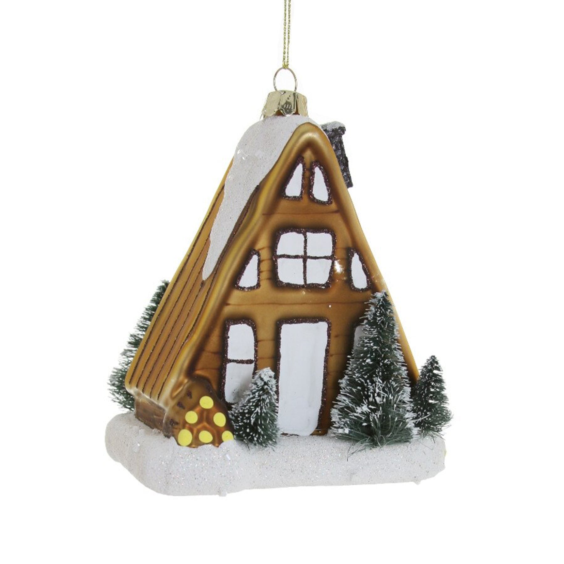 Bring the magic of a snow-covered cabin to your holiday tree with this charming A-frame cottage ornament. Handcrafted from glass, it features detailed wood plank textures and several bottle-brush trees, all dusted with glittering white snow.