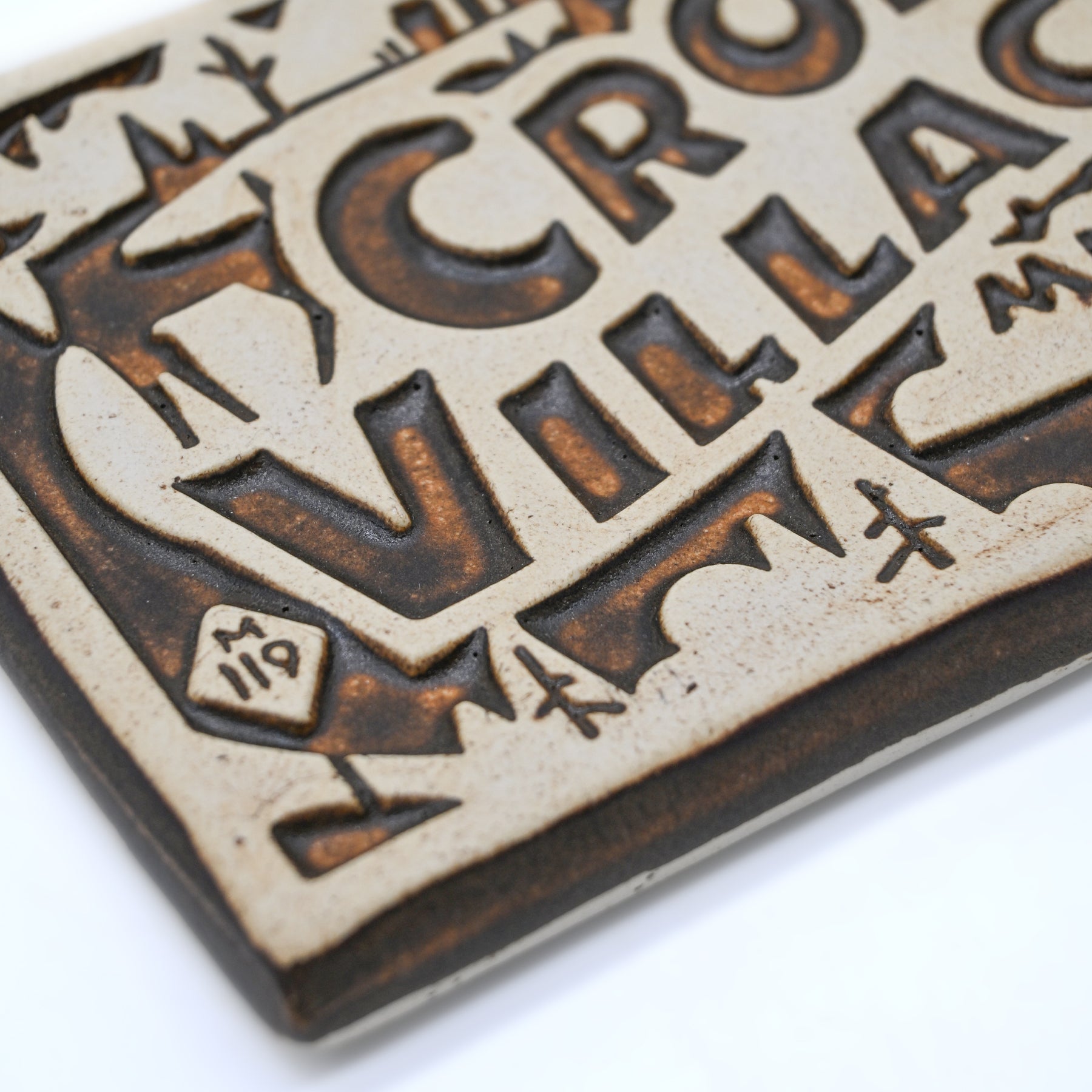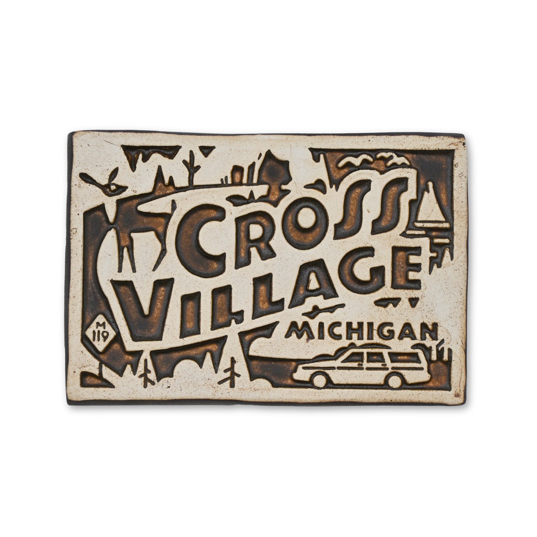 A keepsake that captures the charm of Michigan’s northern coast, this tile reimagines the Peninsulas mural featured on the side of our Cross Village store. Beautifully crafted in glazed ceramic, the rich brown finish contrasts with the lighter unglazed areas, highlighting the artwork’s handcrafted texture and depth.