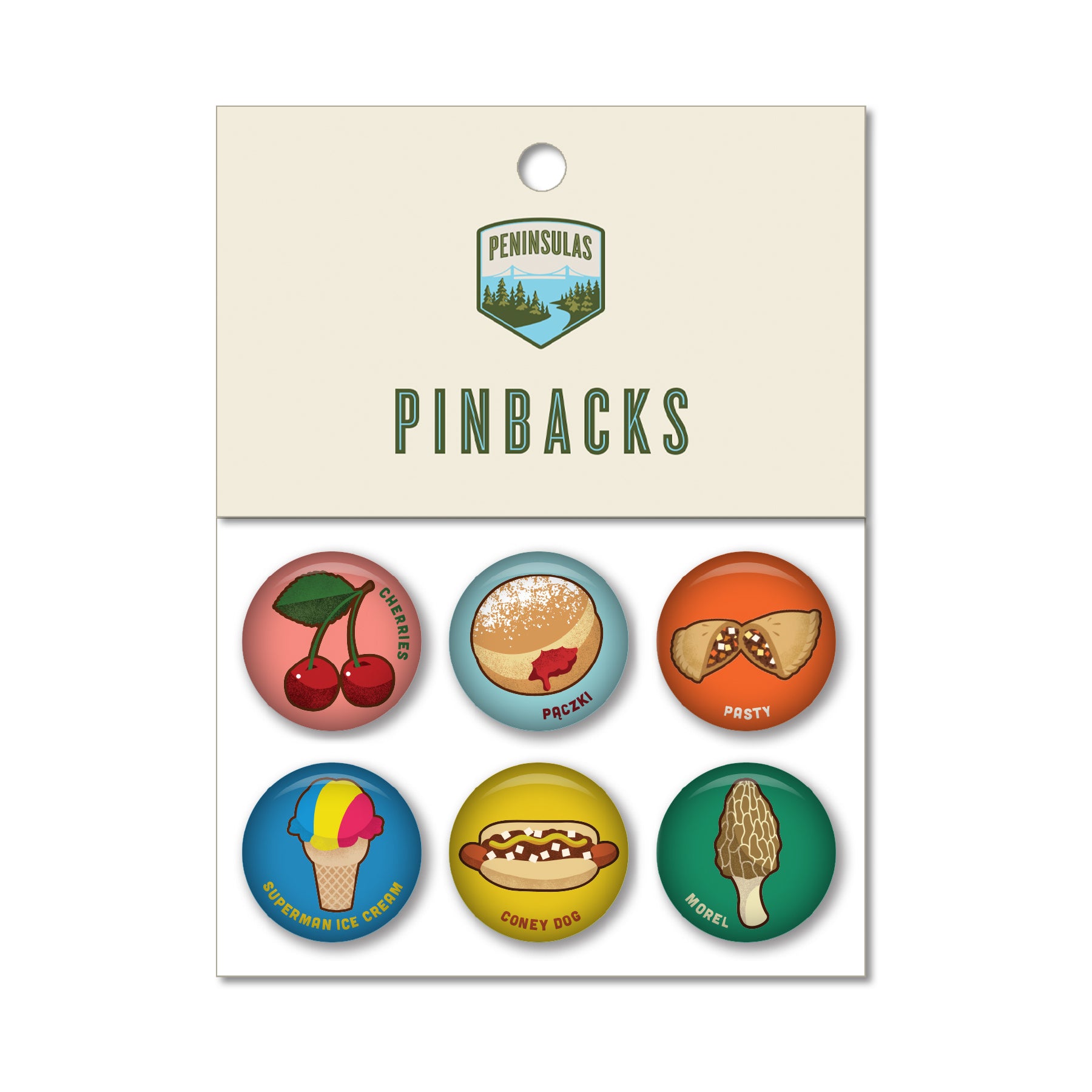 Show your Mitten State pride with this tasty 6-pack of 1” pinback buttons featuring Michigan’s most iconic eats: sweet cherries, savory pasties, delicious paczki, colorful Superman ice cream, classic coney dogs, and earthy morels.